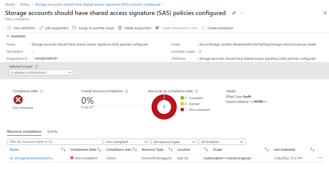 기본 제공 정책의 정책 할당 페이지에서 규정 준수 보기를 선택합니다. 정책 요구 사항을 충족하지 않는 지정된 구독 및 리소스 그룹의 모든 스토리지 계정은 규정 준수 보고서에 나타납니다.