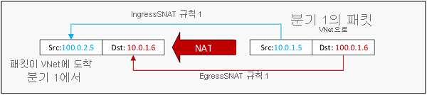 다음 다이어그램에서는 NAT 변환 전후에 분기 1에서 VNet으로 이동하는 IP 패킷을 보여 줍니다.