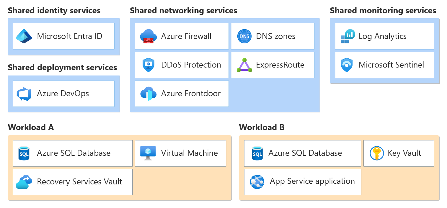 허브 가상 네트워크, 방화벽, ID 서비스 및 Microsoft Sentinel과 같은 보안 서비스와 같은 여러 워크로드 및 공유 서비스 구성 요소가 포함된 Azure 자산을 고려합니다. 자산 전체의 구성 요소는 기능 영역, 워크로드 및 소유권에 따라 그룹화되어야 합니다. 예를 들어 공유 네트워킹 리소스는 단일 구독으로 그룹화되고 네트워킹 팀에서 관리해야 합니다. 개별 워크로드 전용 구성 요소는 자체 세그먼트에 있어야 하며 애플리케이션 계층 또는 기타 조직 원칙에 따라 더 분할될 수 있습니다.