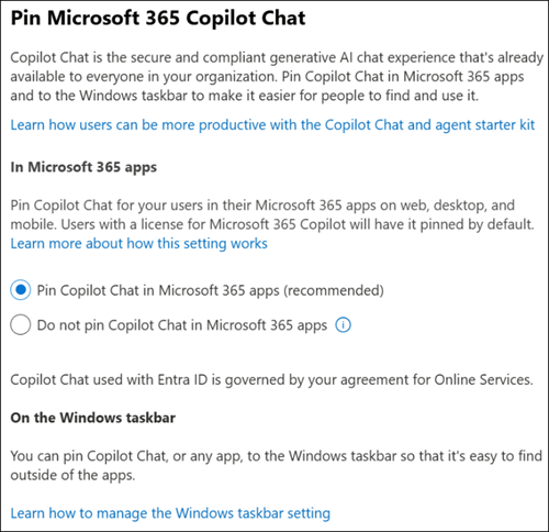 Microsoft 365 앱에서 Copilot Chat 고정(권장): Copilot Chat 모든 사용자에 대해 자동으로 고정됩니다. 사용자에게 메시지가 표시되지 않습니다. 이 옵션은 기본 옵션입니다.