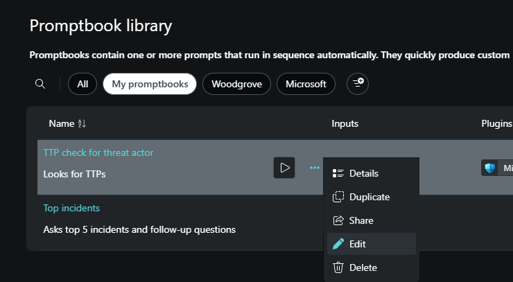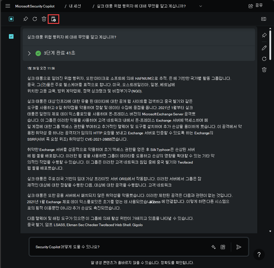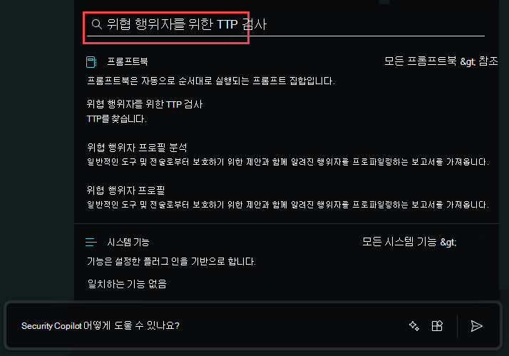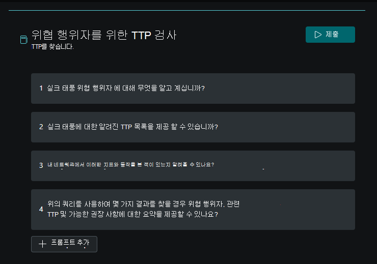Microsoft Security Copilot 프롬프트북에는 특정 보안 관련 작업을 수행하기 위해 함께 제공되는 하나 이상의 프롬프트가 포함되어 있습니다. 이전 응답을 기반으로 하여 프롬프트를 하나씩 실행합니다.