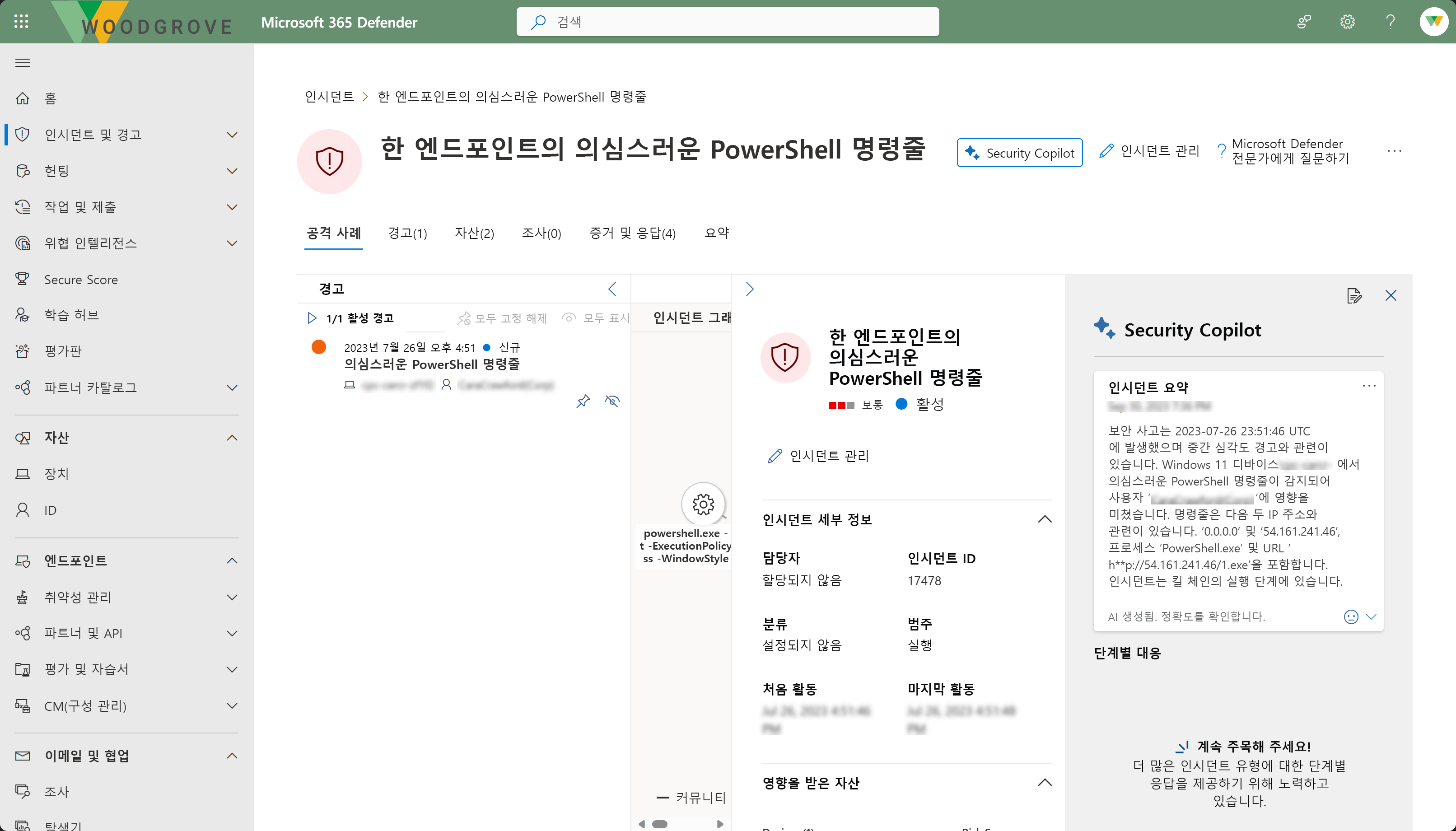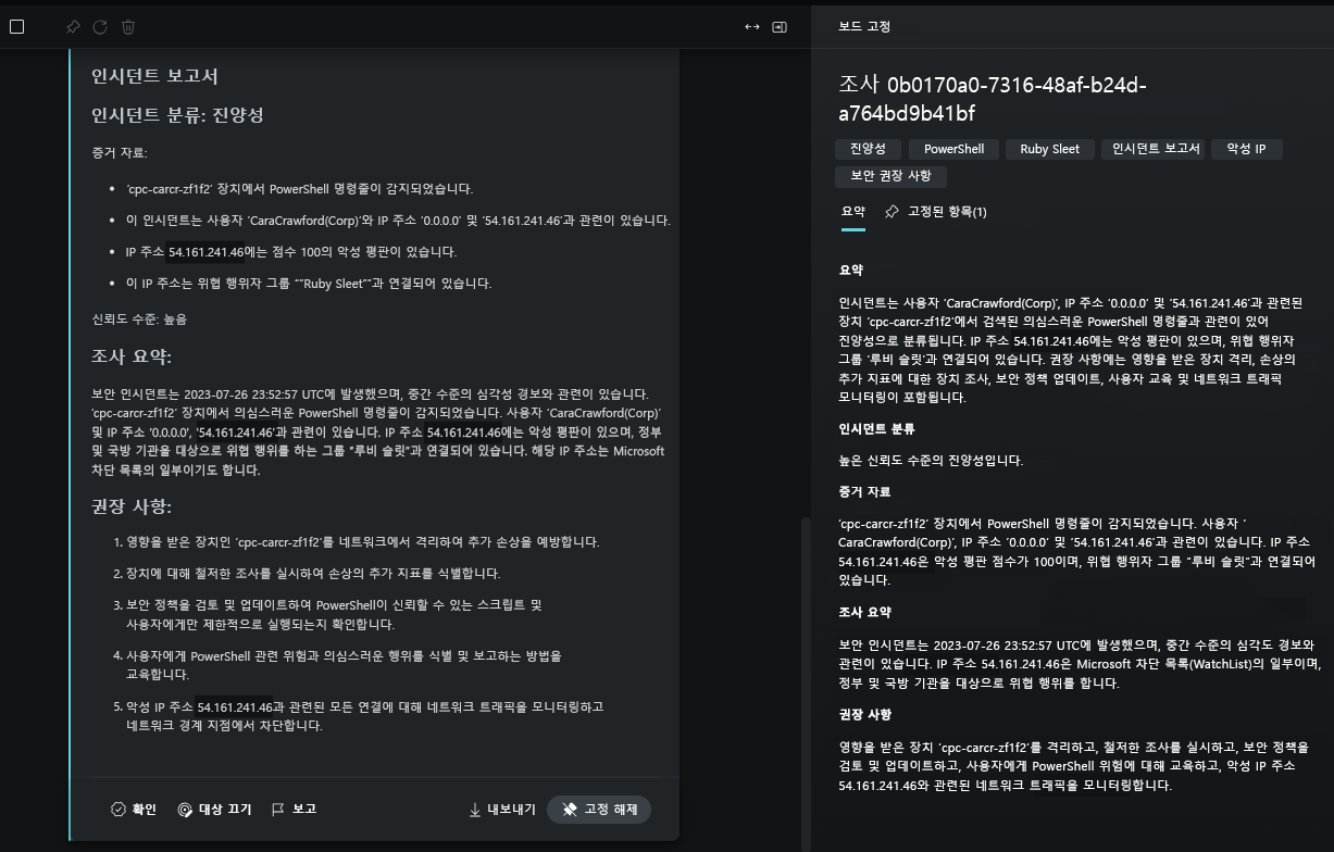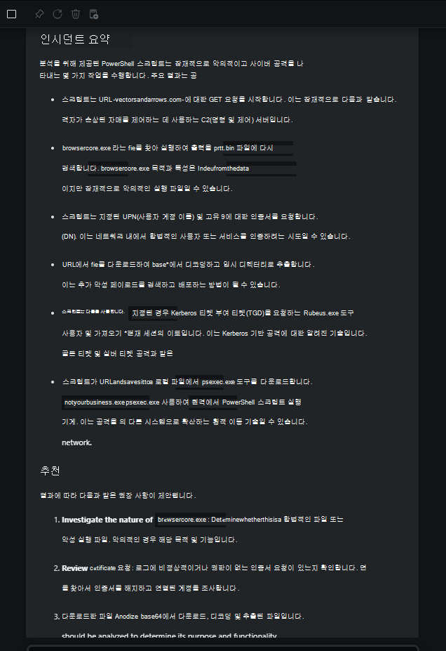 또한 Security Copilot 요약 보고서를 통해 평가를 생성하고 인시던트를 포함하는 권장 사항 집합을 제공했으며, 이를 통해 기술을 개선하는 데도 사용할 수 있습니다.