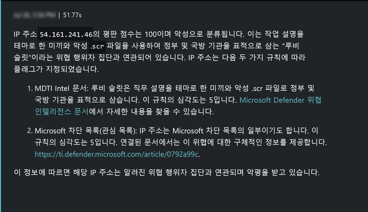 응답은 스크립트의 여러 지표가 알려진 위협 행위자와 연결되어 있음을 나타냅니다. 이 응답을 나중에 사용할 수 있도록 중요한 정보로 고정할 수 있습니다.