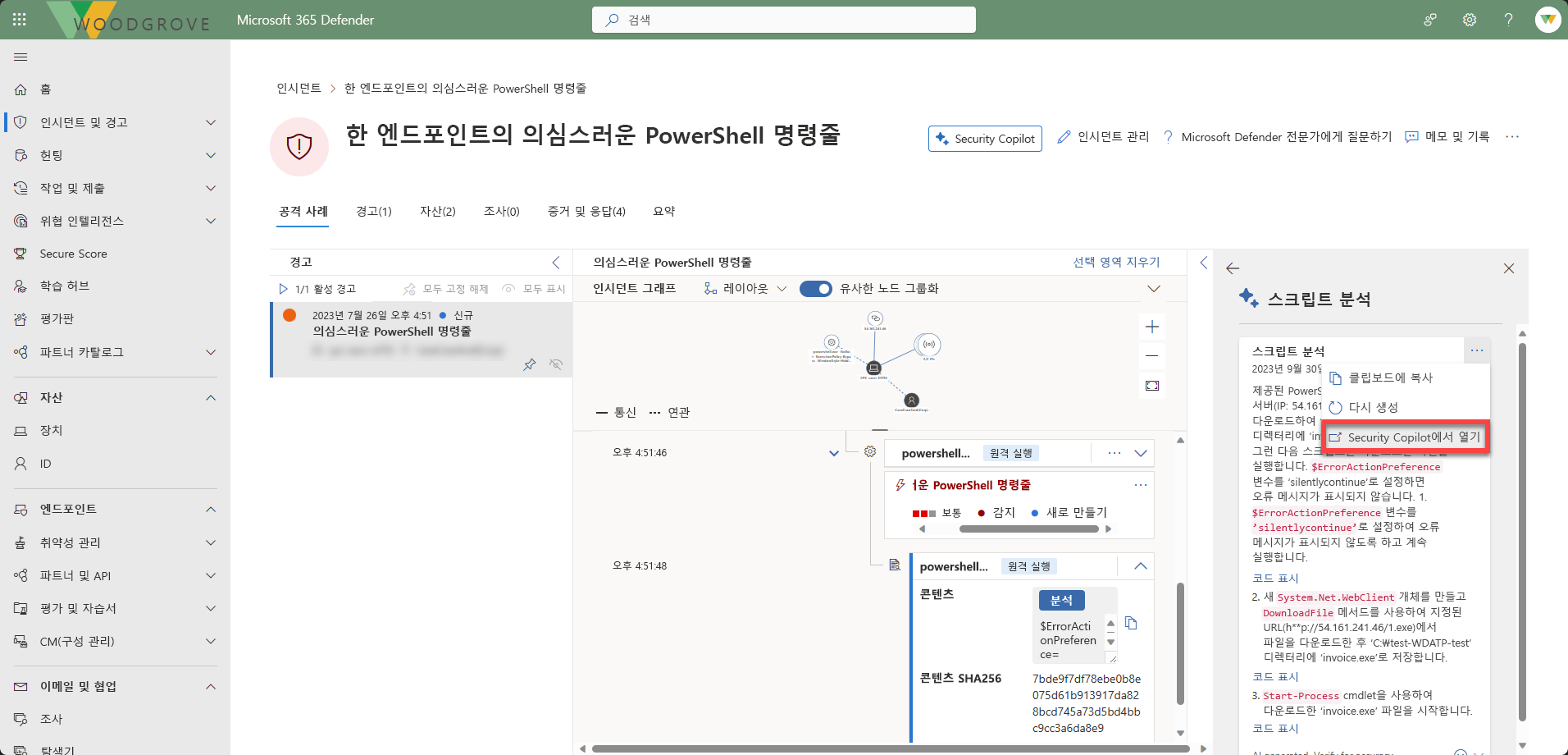 Security Copilot 열기를 선택하여 Security Copilot 독립 실행형 환경에서 조사를 계속합니다.