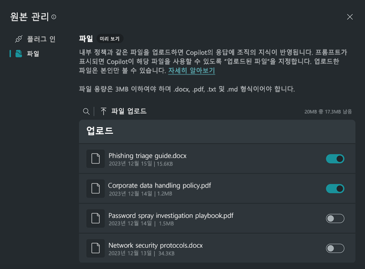 업로드할 수 있는 파일의 예로는 organization 정책 및 규정 준수 문서, 조사 및 응답 절차 및 템플릿이 있습니다. 이 풍부한 지식을 Copilot에 통합하면 Copilot는 기술 자료 또는 문서를 추론하고 운영 요구 사항에 더 관련성이 높고 구체적이며 사용자 지정된 응답을 생성할 수 있습니다.