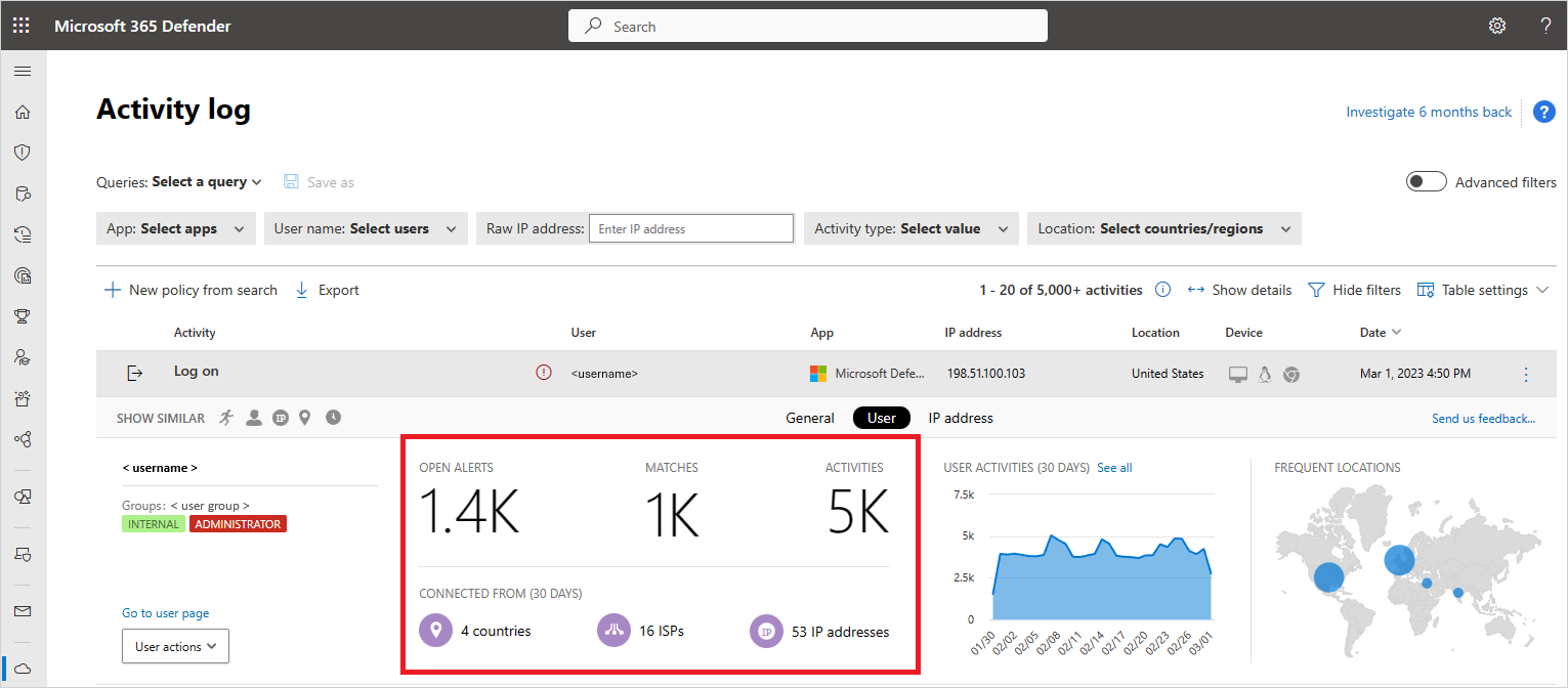활동 로그에서 활동을 열어 활동 서랍을 표시할 수 있습니다. 사용자를 선택하여 사용자 인사이트 탭을 봅니다. 이 탭에는 경고 수, 활동 및 연결 위치와 같은 정보가 포함되어 있으며 이는 조사에서 중요합니다.