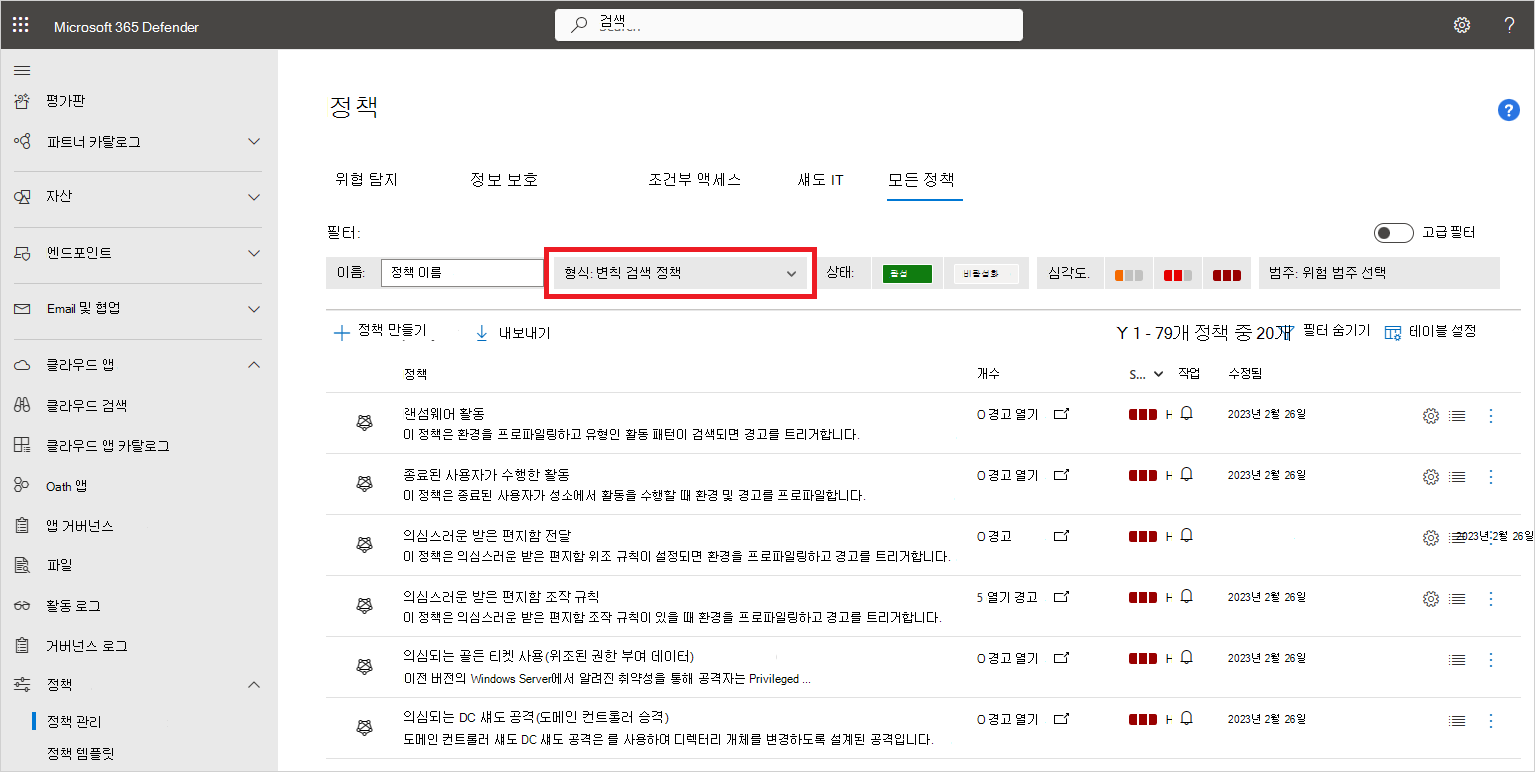 Microsoft Defender 포털에서 Cloud Apps -Policies ->>Policy 관리로 이동합니다. 그런 다음, 정책 유형에 대한 변칙 검색 정책을 선택합니다.
