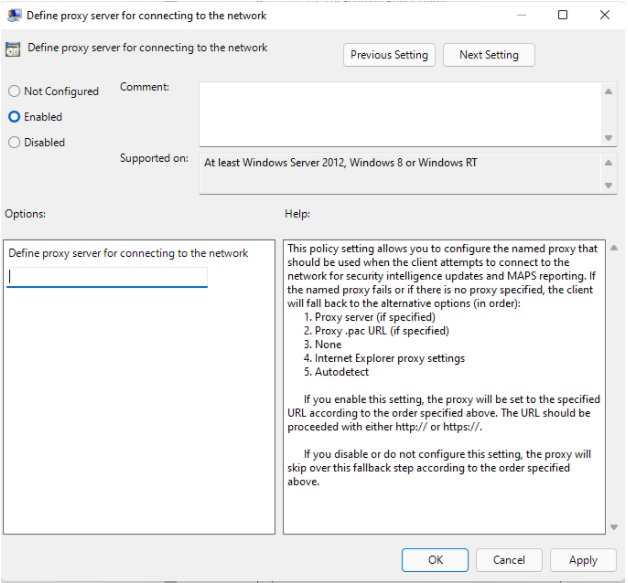 관리 템플릿 > Windows 구성 요소 > Microsoft Defender 바이러스 백신 > 네트워크에 연결하기 위한 프록시 서버를 정의합니다.