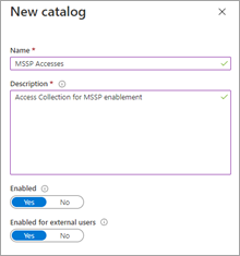이렇게 하려면 고객 Entra ID 테넌트에서 ID 거버넌스: 카탈로그에 액세스하고 새 카탈로그를 추가합니다. 이 예제에서는 MSSP 액세스라고 합니다.