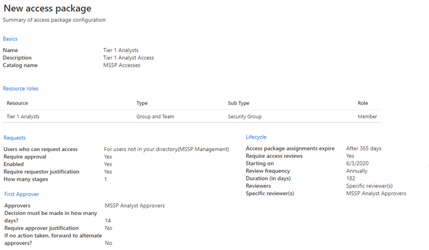이렇게 하려면 고객 Entra ID 테넌트에서 ID 거버넌스: 액세스 패키지에 액세스하고 새 액세스 패키지를 추가합니다. MSSP 승인자 및 각 분석가 계층에 대한 액세스 패키지를 만듭니다. 예를 들어 다음 계층 1 분석가 구성은 다음과 같은 액세스 패키지를 만듭니다.
