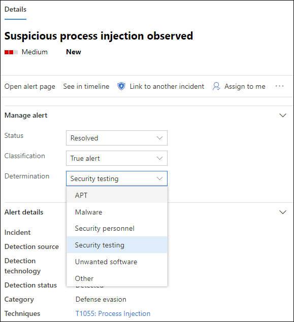 조사가 완료되면 시작한 경고로 돌아가서 경고의 상태 해결됨으로 표시하고 거짓 경고 또는 True 경고로 분류합니다. 경고를 분류하면 이 기능을 조정하여 더 많은 실제 경고와 덜 거짓 경고를 제공할 수 있습니다.