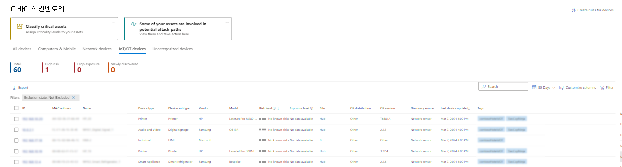 네트워크 디바이스 및 IoT/OT 디바이스 탭에서 공급업체, 모델 및 디바이스 유형과 같은 정보도 표시됩니다.