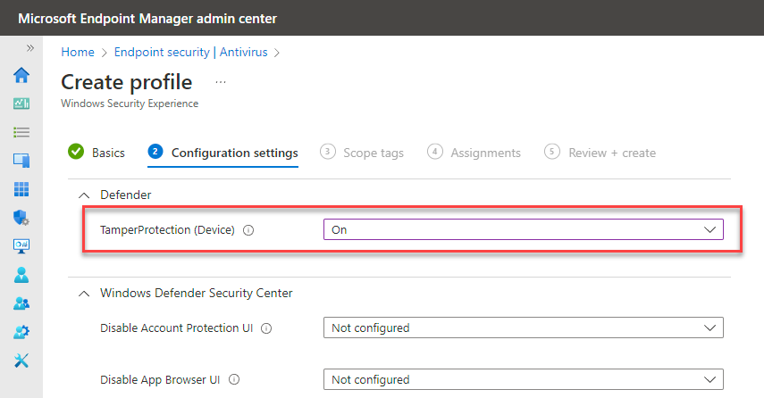 Microsoft Intune에서 변조 방지 설정(또는 해제)