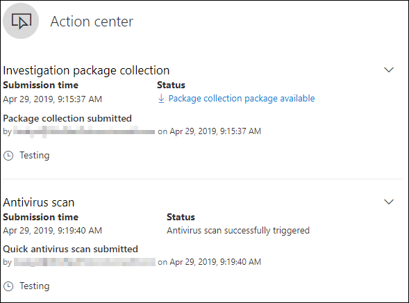 알림 센터(https://security.microsoft.com/action-center)는 디바이스 또는 파일에서 수행된 작업에 대한 정보를 제공합니다. 다음 세부 정보를 볼 수 있습니다.