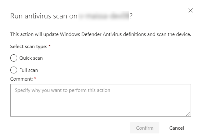 바이러스 백신 검사 실행을 선택한 경우 실행하려는 검사 유형(빠른 또는 전체)을 선택하고 검사를 확인하기 전에 주석을 추가합니다.