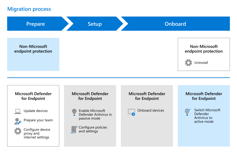 엔드포인트용 Defender로 마이그레이션하는 경우 활성 모드에서 비 Microsoft 바이러스 백신/맬웨어 방지 보호로 시작합니다. 그런 다음 수동 모드에서 Microsoft Defender 바이러스 백신을 구성하고 엔드포인트용 Defender 기능을 구성합니다. 그런 다음 organization 디바이스를 온보딩하고 모든 것이 올바르게 작동하는지 확인합니다. 마지막으로 디바이스에서 비 Microsoft 솔루션을 제거합니다.