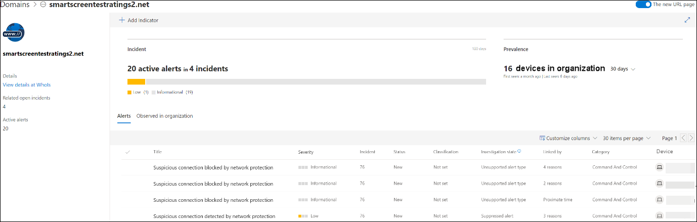 경고에서 웹 사이트의 URL 또는 도메인을 선택하여 자세히 알아볼 수 있습니다. 그러면 다음을 비롯한 다양한 정보가 포함된 특정 URL 또는 도메인에 대한 페이지가 열립니다.