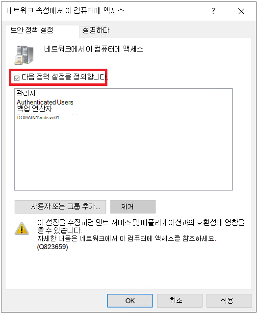 이 절차는 네트워크 설정에서 이 컴퓨터 액세스 설정이 기본적으로 구성되지 않으므로 네트워크에서 이 컴퓨터 액세스 설정을 구성한 경우에만 필요합니다.