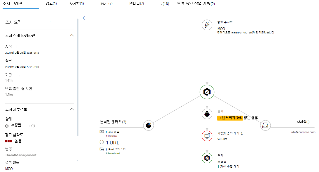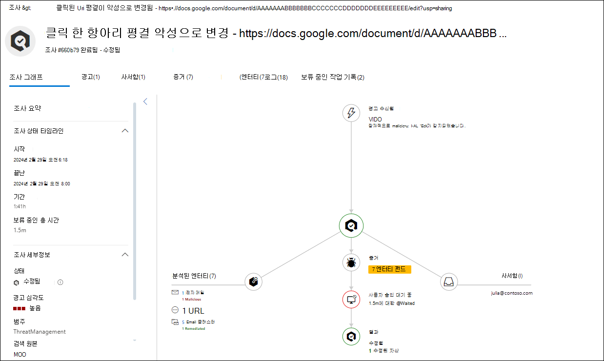 보류 중인 작업: 조사 결과 위협(예: 악의적인 전자 메일, 악성 URL 또는 위험한 사서함 설정)이 발견되었으며 위협을 수정하기 위한 작업이 승인을 기다리고 있습니다.