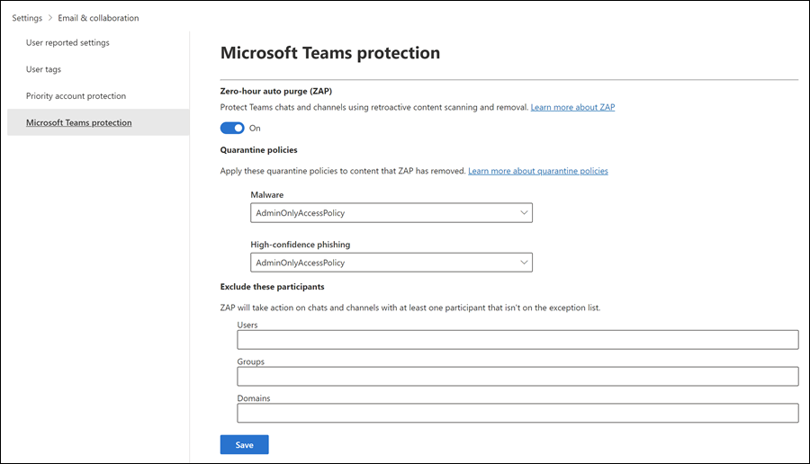 참가자 제외 섹션: Teams 보호를 위해 ZAP에서 제외할 사용자, 그룹 또는 도메인을 지정 합니다 . 제외는 메시지 보낸 사람이 아니라 메시지 받는 사람에게 중요합니다. 자세한 내용은 Microsoft Teams의 ZAP(0시간 자동 제거)를 참조하세요.