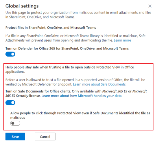- 이 문서에서 설명한 대로 Microsoft Defender 포털 또는 Exchange Online PowerShell에서 안전한 문서를 켭니다.