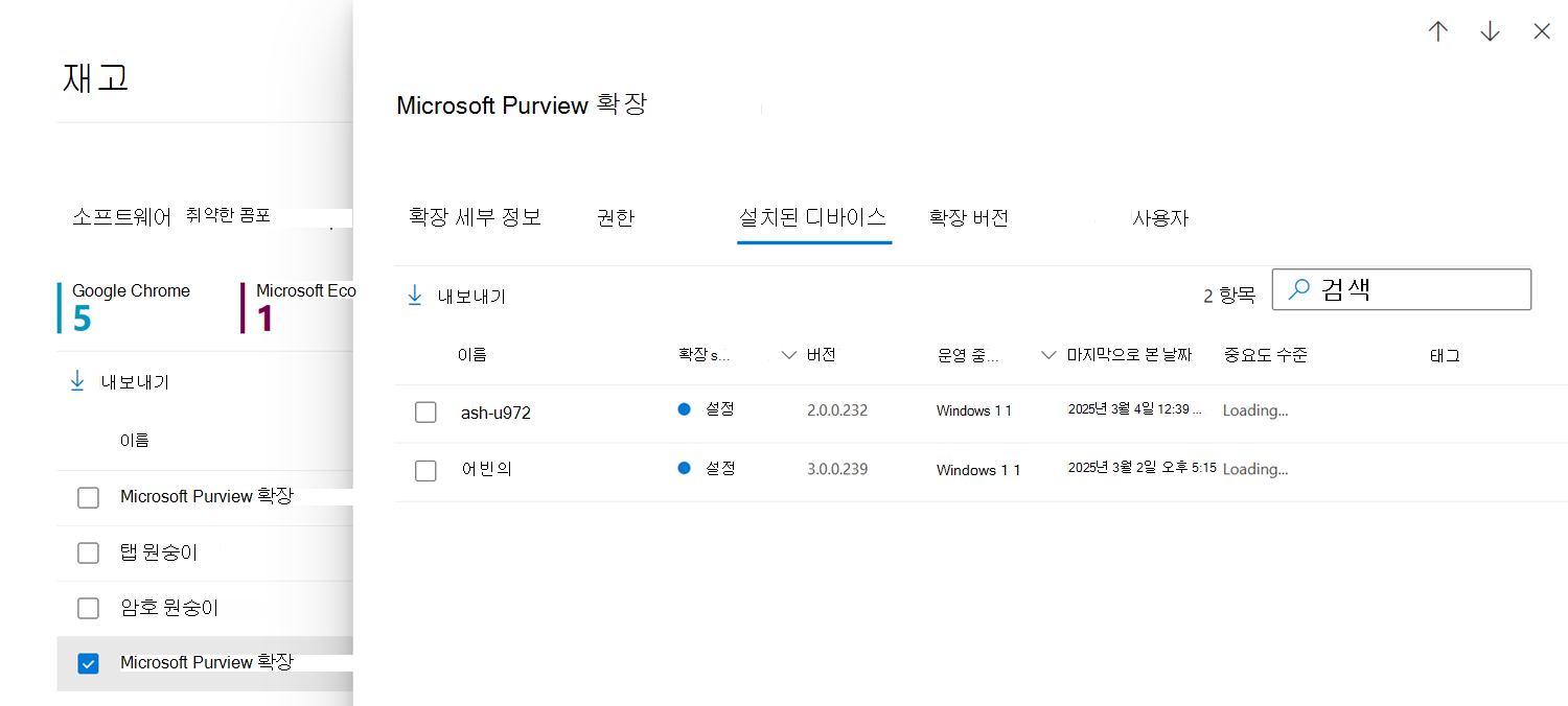 브라우저 확장 페이지에는 organization 여러 브라우저에 설치된 브라우저 확장 목록이 표시됩니다. 브라우저 확장 세부 정보는 특정 브라우저에 있는 모든 사용자에 대해 수집됩니다. 설치된 각 확장에 대해 브라우저별로 설치된 디바이스, 설치한 사용자 및 디바이스의 설정 또는 해제 여부를 확인할 수 있습니다.