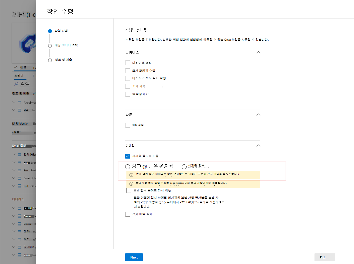 - 전자 메일 메시지를 정크, 받은 편지함 또는 지운 편지함 폴더로 이동하려면 이 작업을 선택합니다.받은 편지함 옵션을 선택하여 격리된 항목(instance, 가양성의 경우)으로 구성된 전자 메일 결과를 이동할 수 있습니다.
