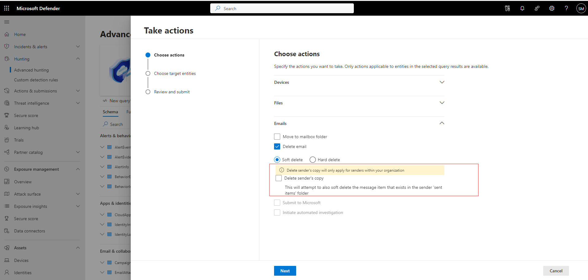 고급 헌팅을 통해 전자 메일에 대한 작업을 수행하려면 전자 메일을 검색하고 제거하는 Office 365용 Microsoft Defender 역할이 필요합니다.