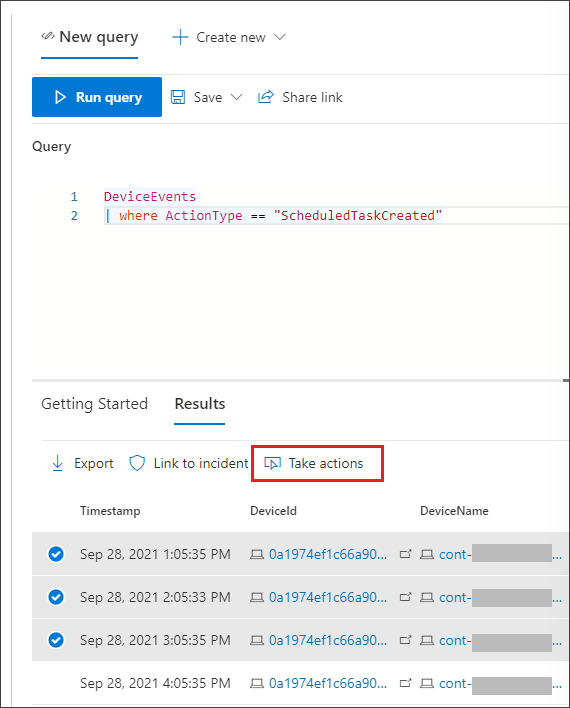 파일을 찾아 격리하려면 쿼리 결과에 디바이스 식별자로 값도 포함되어 DeviceId
