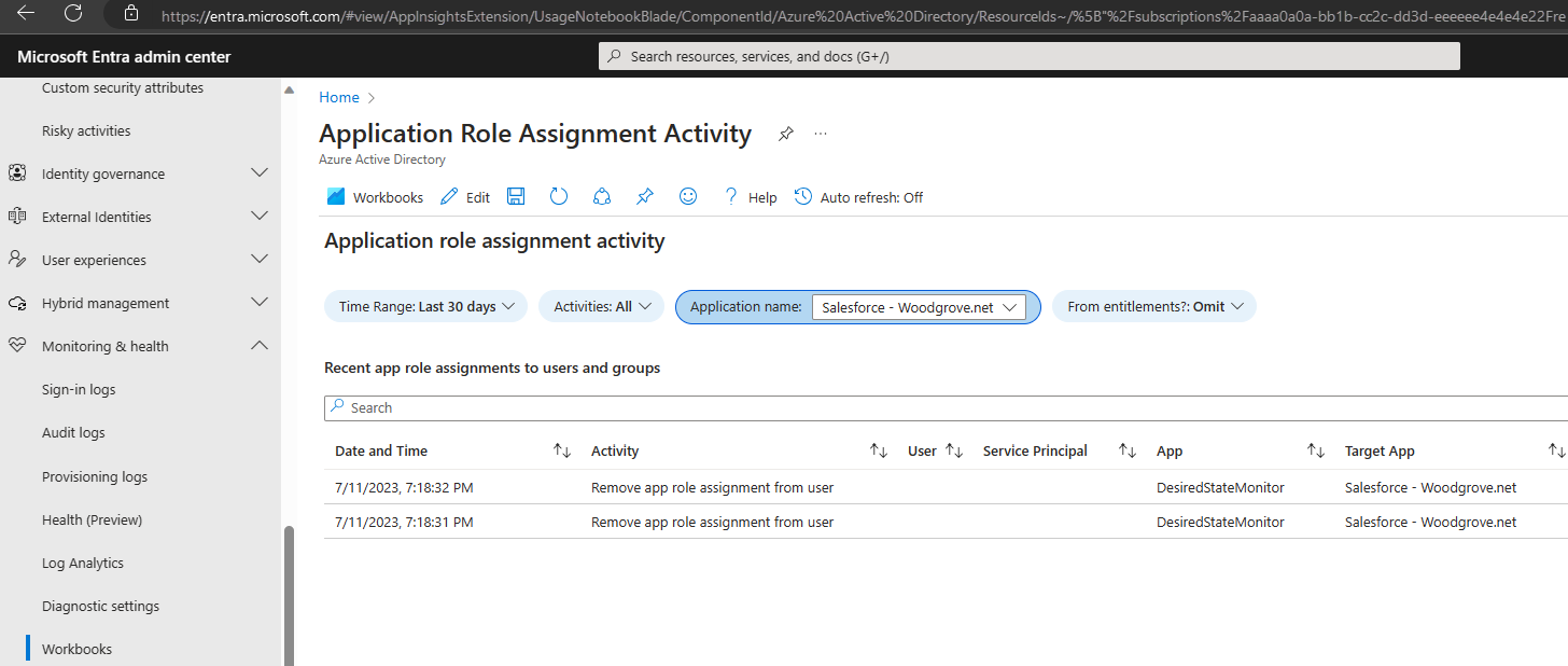 애플리케이션 역할 할당 활동 통합 문서는 글로벌 관리자가 애플리케이션 역할에 사용자를 직접 할당하는 것과 같이 액세스 패키지 할당으로 인한 것이 아닌 애플리케이션의 역할 할당에 대한 변경이 있었는지를 보여줍니다.