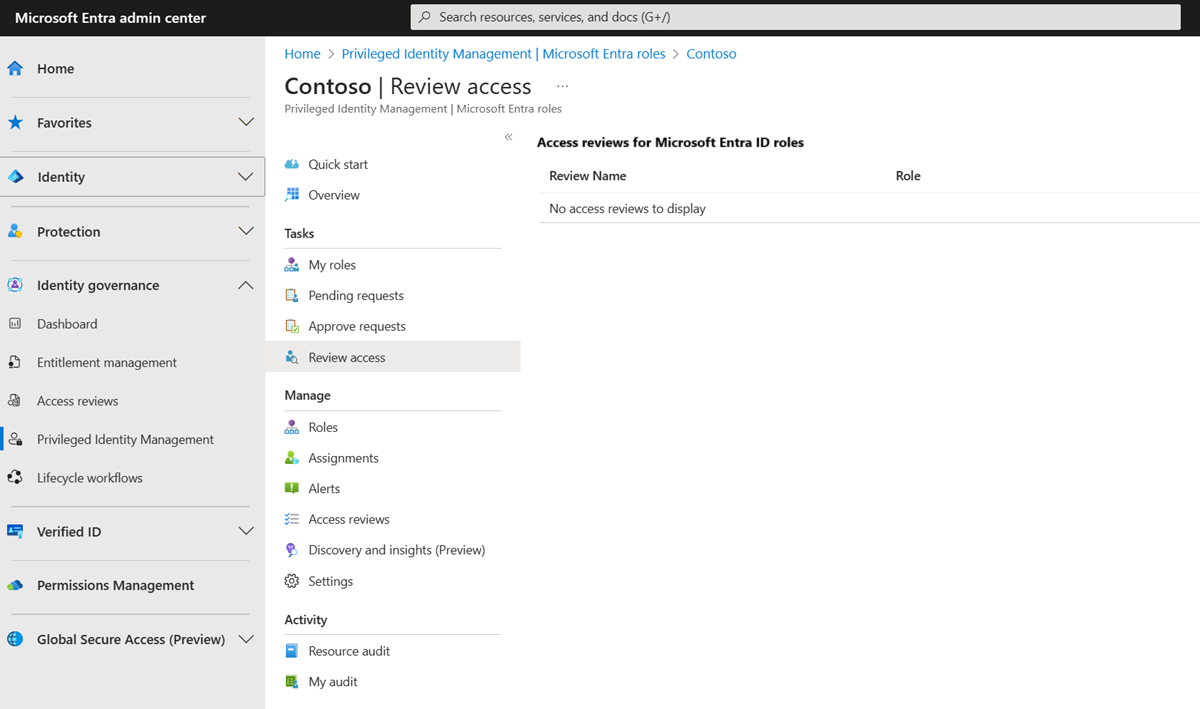 관리하려는 액세스 검토를 선택합니다. 다음은 Azure 리소스 및 Microsoft Entra 역할 모두에 대한 액세스 검토 개요의 샘플 스크린샷입니다.