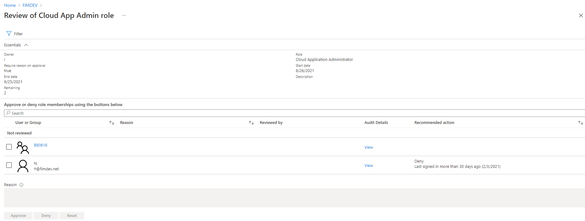 사용자가 계속 역할에 액세스해야 하는지 여부에 따라 액세스를 승인하거나 거부할 수 있습니다. 역할을 유지하려는 경우 승인 또는 더 이상 액세스 권한이 필요하지 않은 경우 거부 를 선택합니다. 검토가 종료되고 관리자가 결과를 적용할 때까지 사용자의 할당 상태는 변경되지 않습니다. 특정 거부된 사용자에게 결과가 적용될 수 없는 일반적인 시나리오에는 다음이 포함될 수 있습니다.