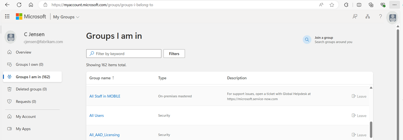 | 내 그룹 포털 | 사용자는 그룹을 관리하고 여기에서 그룹 가입에 대한 액세스를 요청할 수 있습니다. 그룹을 만들 때 멤버 자격 옵션을 변경할 수 있습니다. |
