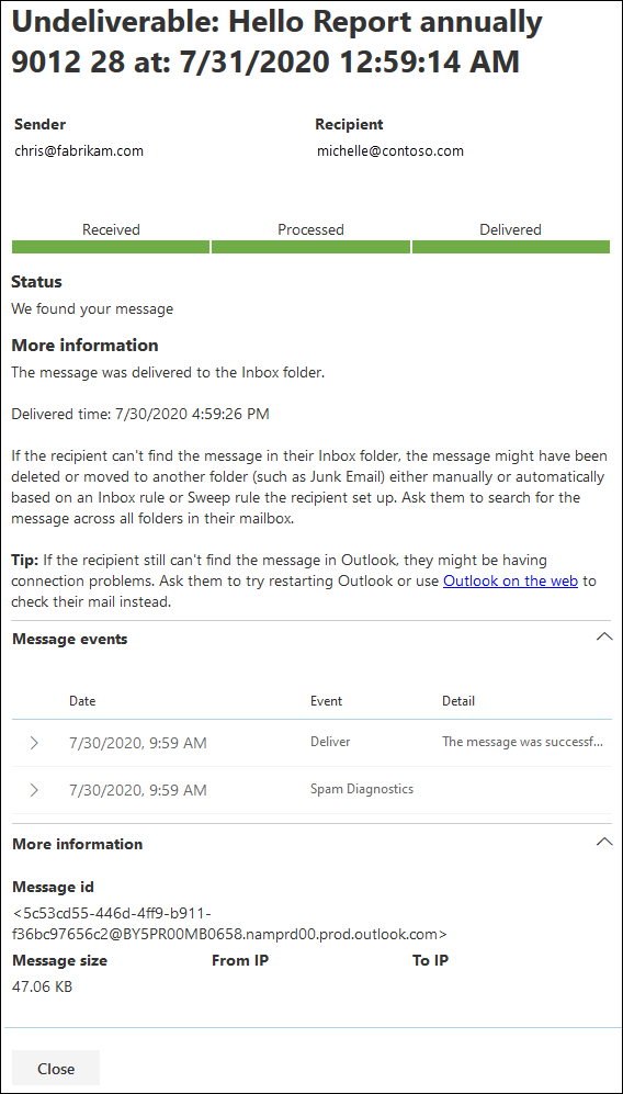 MessageTraceID 매개 변수는 네트워크 메시지 ID 값을 사용합니다. 이 예제에서는 입니다