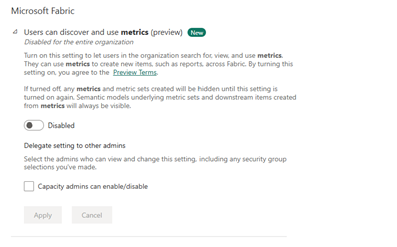 조직의 메트릭 허브를 켜려면 Power BI 또는 Fabric 테넌트 관리자가 조직의 메트릭에 대한 테넌트 관리자 설정을 켜야 합니다. 설정을 켜면 메트릭 허브 내의 새 메트릭 집합 영역이 표시됩니다. 메트릭 집합 설정은 기본적으로 사용하지 않도록 설정됩니다. 이 설정을 켜면 클래식 메트릭 허브 환경의 새 메트릭 허브 UI(메트릭 집합)가 표시되어 사용자가 메트릭 및 메트릭 집합을 만들고, 찾아보고, 사용할 수 있습니다.