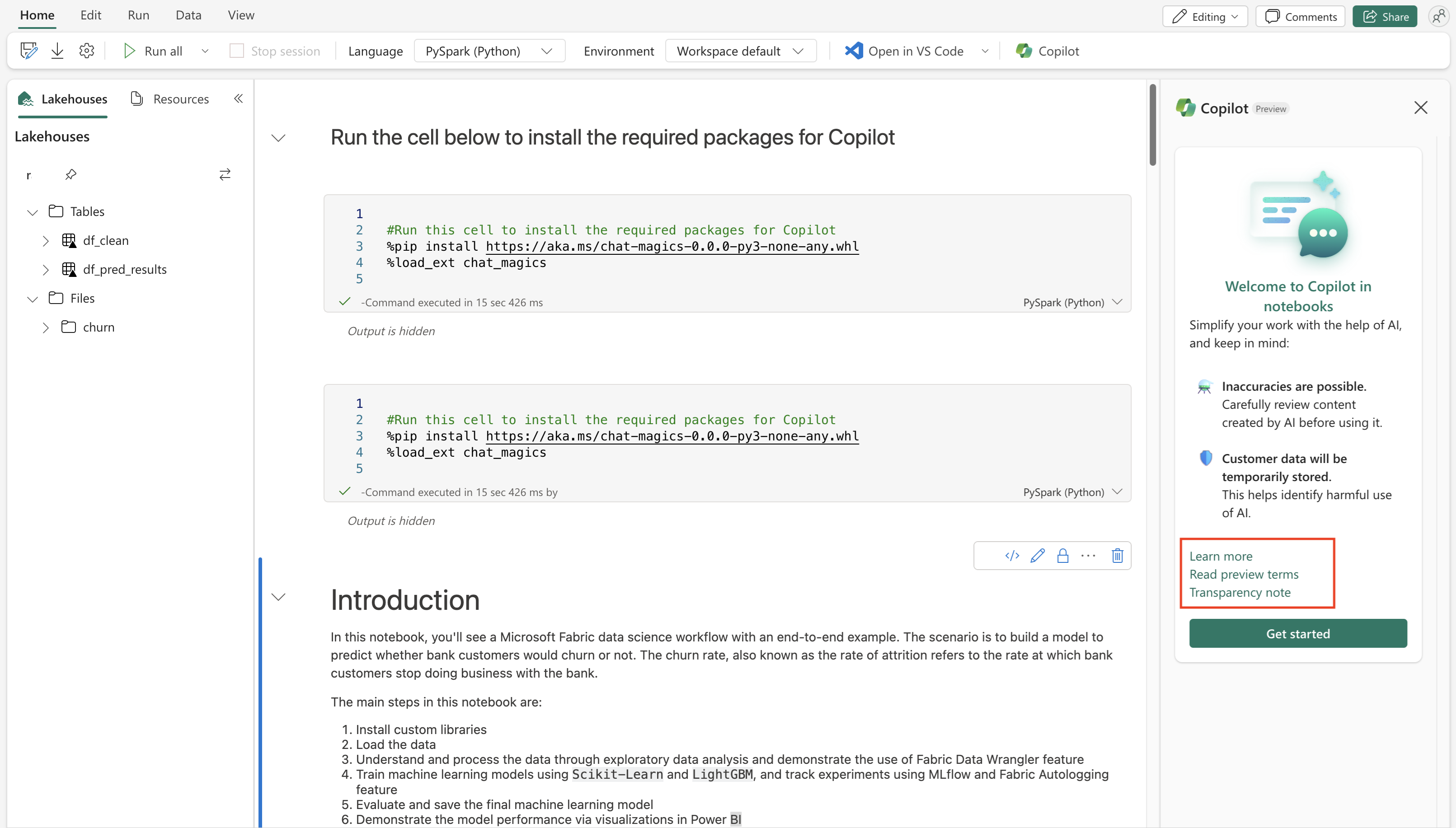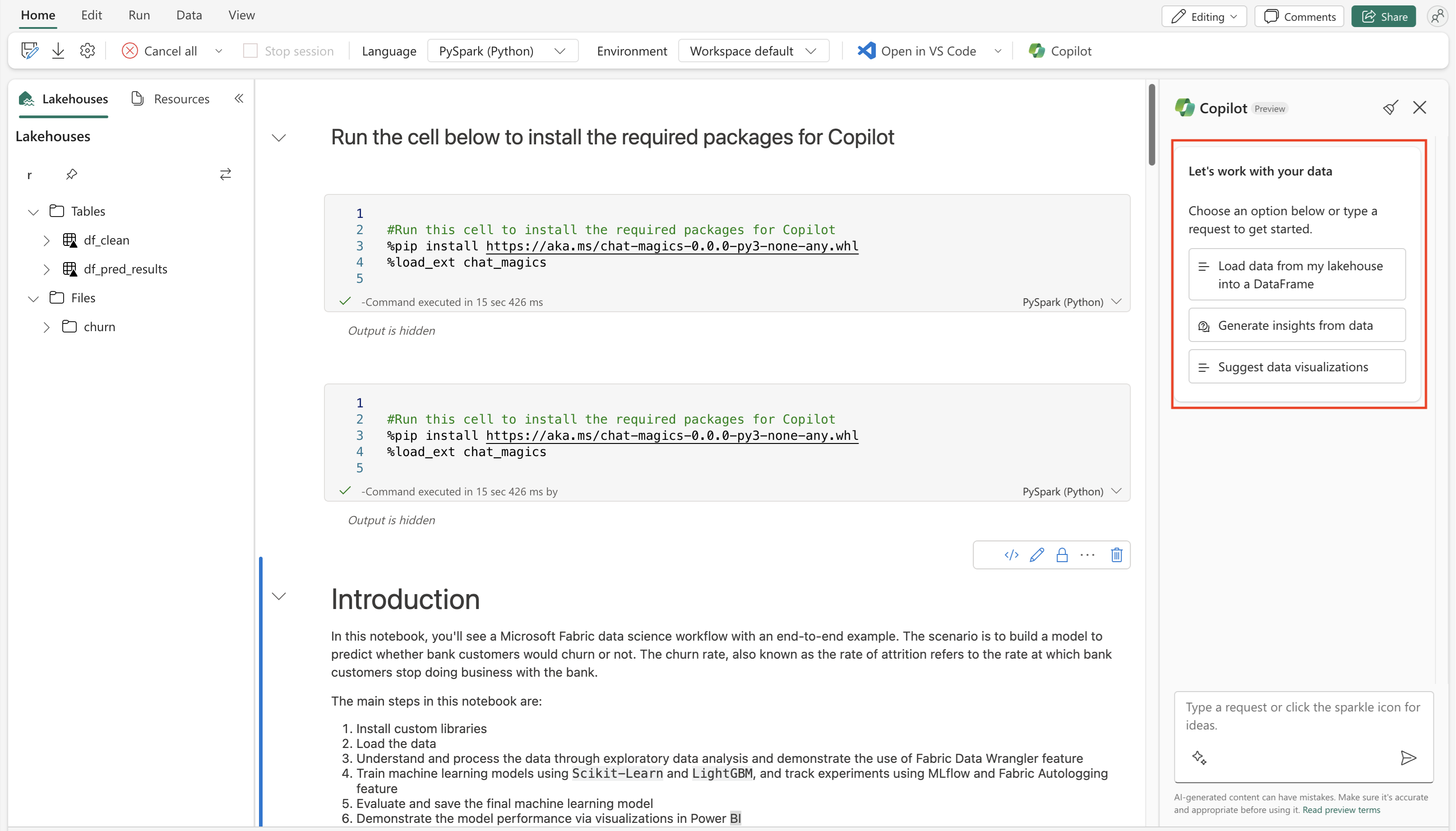 Copilot 창을 사용하려면 Chat-magics의 설치 셀이 Spark 세션 내에서 성공적으로 실행되어야 합니다.