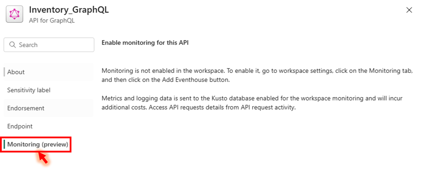 - 모니터링 및 로깅 기능을 사용하기 전에 Fabric에서 GraphQL에 대한 API가 있어야 합니다. 자세한 내용은 Fabric에서 GraphQL용 API 만들기 및 데이터추가를 참조하세요.