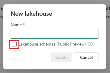 Lakehouse에 대한 스키마 지원을 사용하도록 설정하려면 Lakehouse 스키마(공개 미리 보기) 옆에 있는 확인란을 선택합니다.