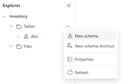 Lakehouse를 만든 후에는 테이블 아래에서 dbo라는 기본 스키마를 찾을 수 있습니다. 이 스키마는 항상 존재하며 변경하거나 제거할 수 없습니다. 새 스키마를 만들려면 테이블을 마우스로 가리키고 ...를 선택하고 새 스키마를 선택합니다. 스키마 이름을 입력하고 만들기를 선택합니다. 테이블 아래에 스키마가 사전순으로 나열됩니다.