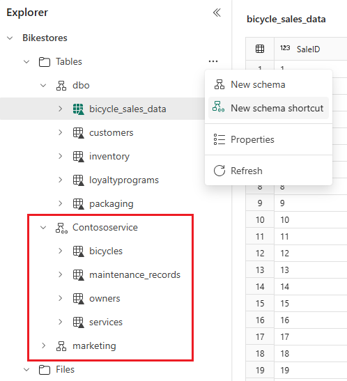 다른 Fabric Lakehouse 또는 외부 스토리지에서 여러 델타 테이블을 참조하려면 선택한 스키마 또는 폴더 아래에 모든 테이블을 표시하는 스키마 바로 가기를 사용합니다. 원본 위치의 테이블에 대한 변경 내용도 스키마에 표시됩니다. 스키마 바로 가기를 만들려면 테이블을 마우스로 가리키고 ...를 선택하고 새 스키마 바로 가기를 선택합니다. 그런 다음, 다른 Lakehouse의 스키마를 선택하거나 외부 스토리지인 ADLS(Azure Data Lake Storage) Gen2와 같은 장소에 있는 Delta 테이블 폴더를 선택합니다. 그러면 참조된 테이블이 있는 새 스키마가 만들어집니다.