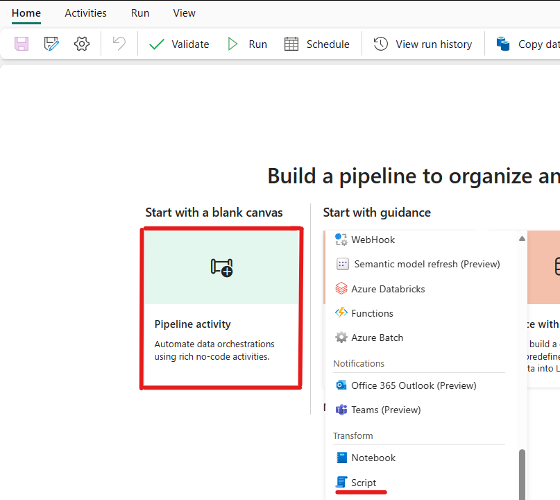 또는 위쪽의 파이프라인 작업 리본에서 스크립트 작업을 검색하고 이를 선택하여 파이프라인 캔버스에 추가할 수 있습니다.