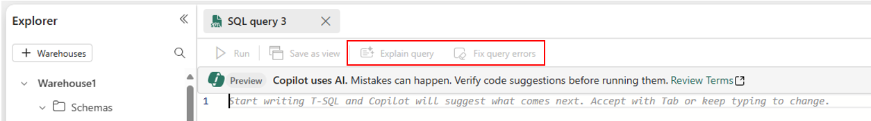 Copilot는 웨어하우스 스키마, 쿼리 탭 콘텐츠 및 실행 결과에 대한 정보를 사용하여 쿼리에 대한 관련성 있고 유용한 피드백을 제공합니다.