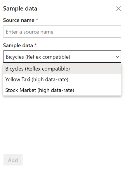 오른쪽 창에서 캔버스에 표시할 원본 이름을 입력하고 이벤트 스트림에 추가할 샘플 데이터를 선택한 다음, 추가를 선택합니다.