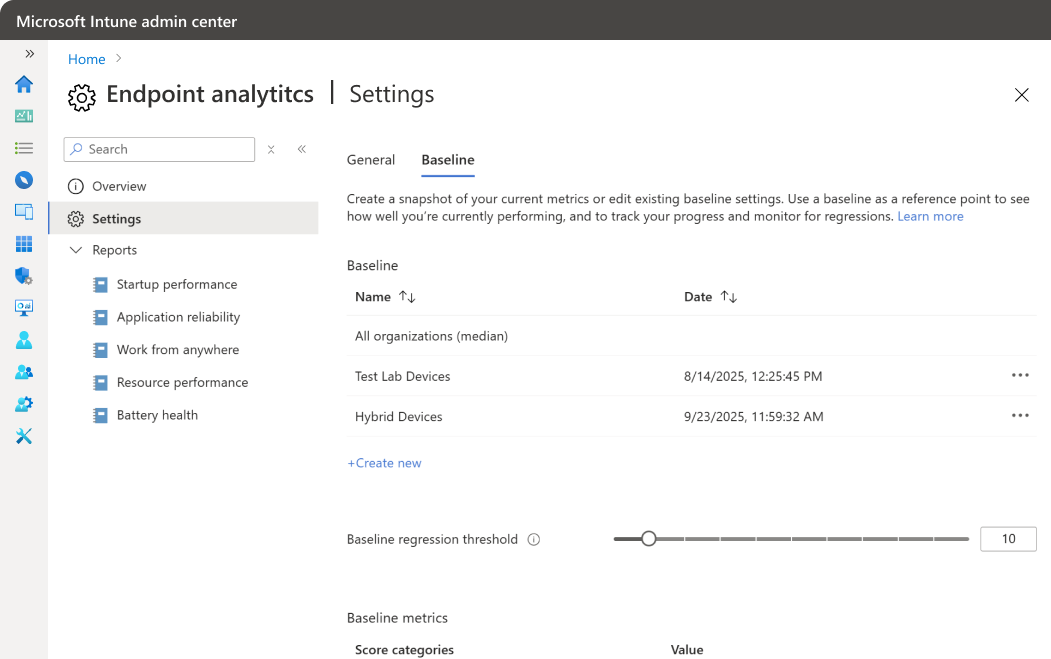 데이터 수집 정책을 만들고 분석 환경을 정의하는 설정을 조정하여 Intune에서 엔드포인트 분석을 구성합니다.