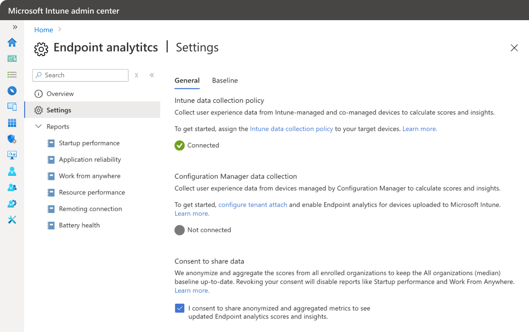 디바이스에 대한 데이터 수집을 켜고 데이터 업로드를 사용하도록 설정하여 Configuration Manager 엔드포인트 분석을 구성합니다. 그런 다음 Intune 관리 센터에서 분석 환경을 정의하는 설정을 조정합니다.