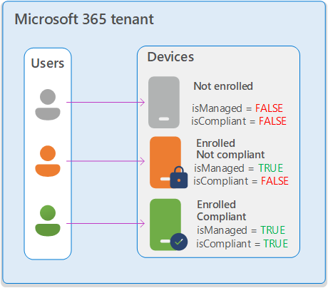 Microsoft Graph PowerShell의 디바이스 cmdlet은 인식된 디바이스의 등록 및 규정 준수 상태 표시합니다.