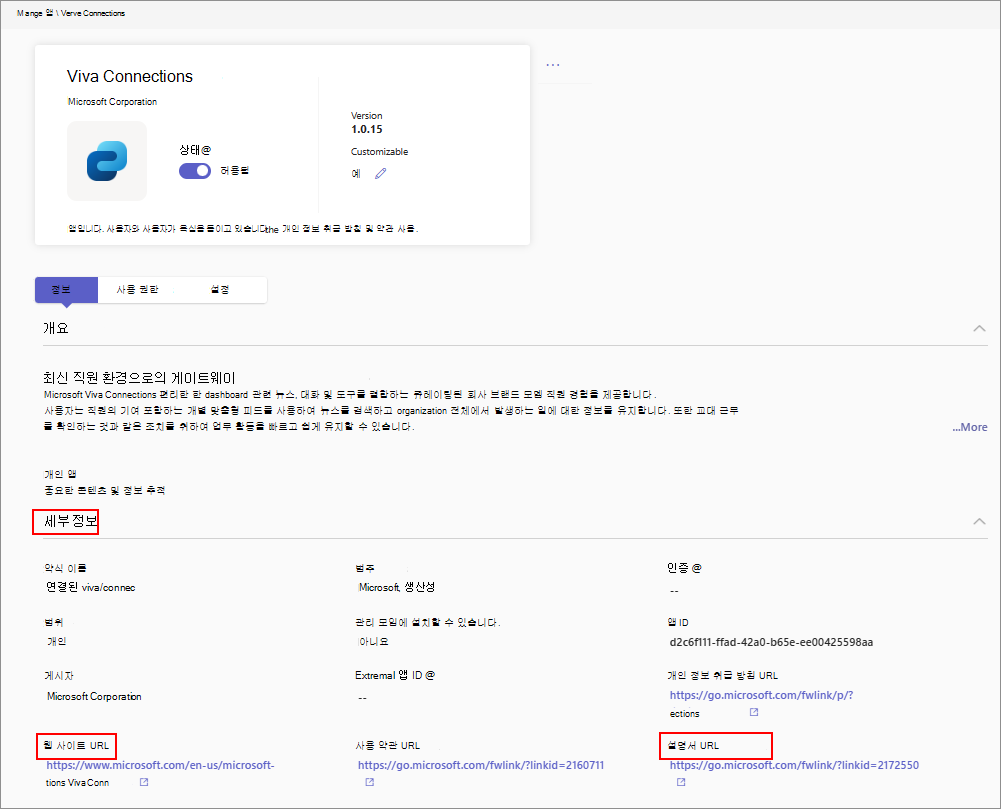 Teams 관리 센터의 앱 관리 페이지에서 앱의 앱세부 정보 페이지입니다.