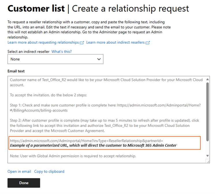 - 포함된 URL을 사용하여 고객 전자 메일을 만들고 6단계에서 설명한 대로 고객에게 Microsoft 고객 계약에 동의하도록 초대하여 고객에게 계약검토하고 수락하도록 초대합니다.