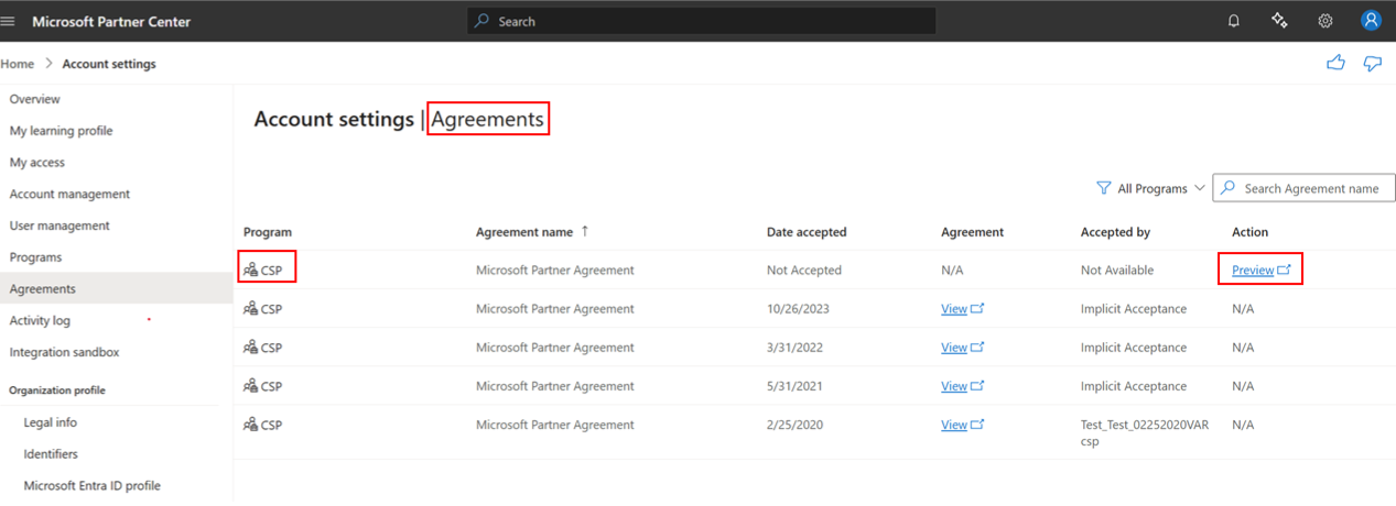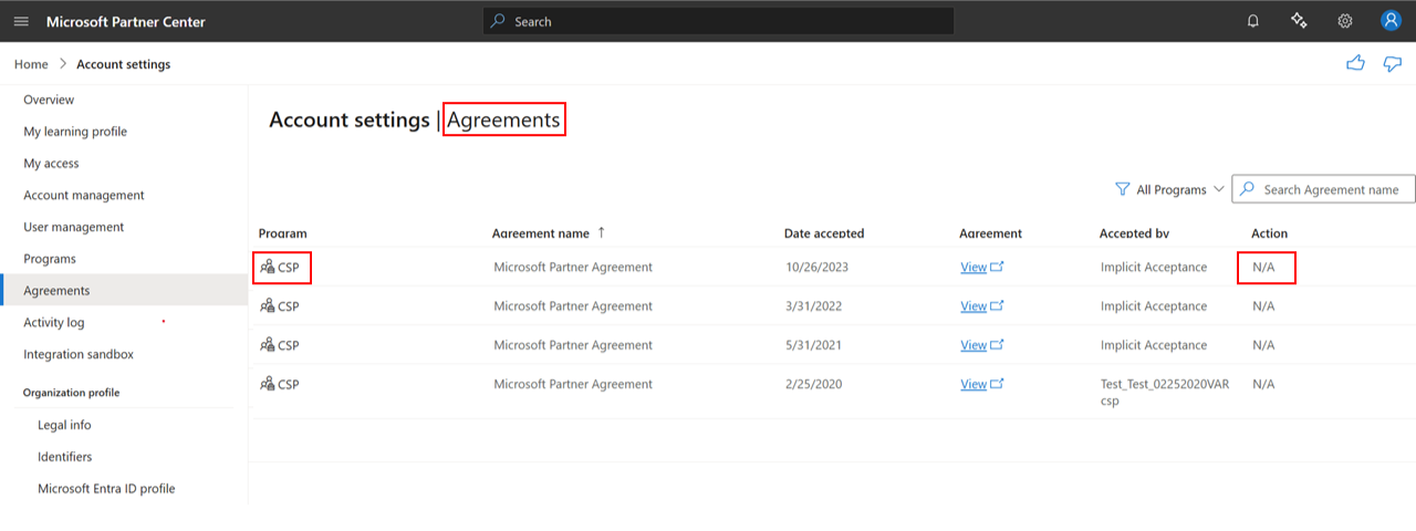 이전에 CSP 파트너로 파트너 센터로 이동한 경우 전역 관리자 자격 증명을 사용하여 계약 페이지에서 Microsoft 파트너 계약에 동의합니다. Microsoft 파트너 계약이 법적 프로필프로그램 정보 에서 서명된 것을 확인하거나 계약 페이지에서 Microsoft 파트너 계약을 검색하여 확인할 수 있습니다 .